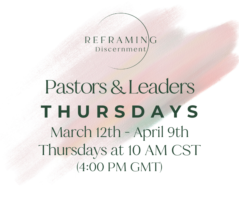 This five week cohort coincides with the Reframing Discernment online course. There will be a once-a-week, online call that begins March 12th and goes until April 9th. Each Zoom call will occur on Thursday at 10:00 AM CST/7 PM GMT. Please note any time changes with spring daylight savings that may change the times. Each call will last 90 minutes and is facilitated by our certified facilitators. Each Zoom session will last 90 minutes.